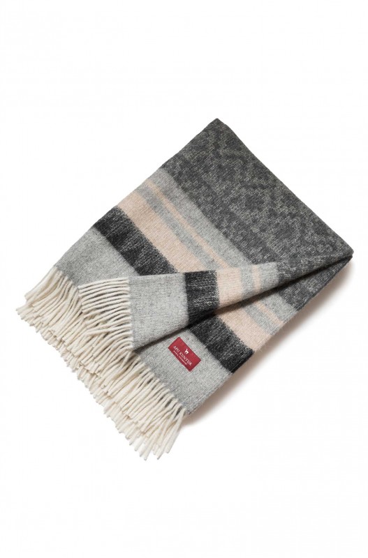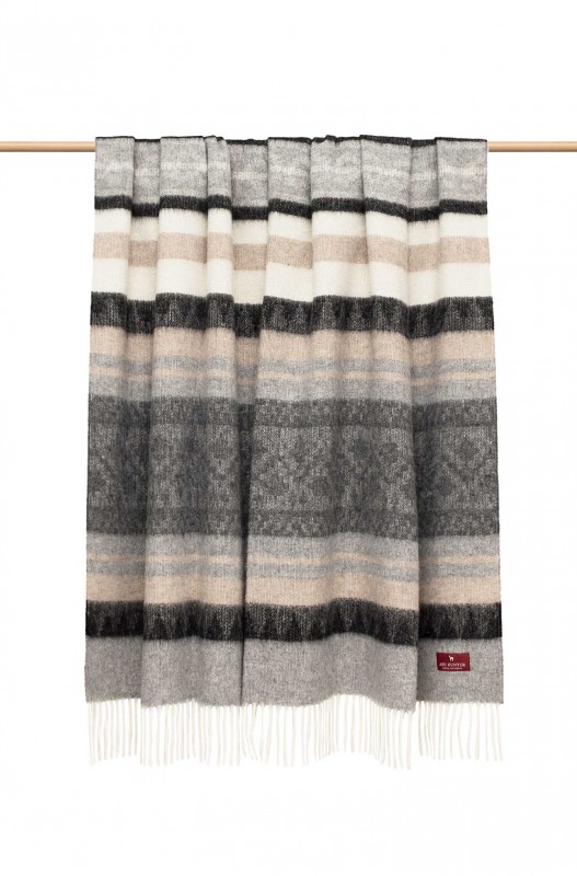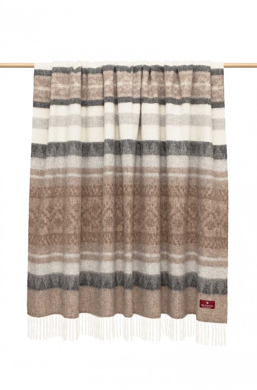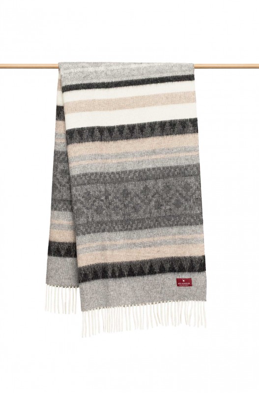 Die Decke MUNDO vereint verschieden breite Blockstreifen mit ornamentalen Jacquard-Mustern. Das weich gemusterte Design wirkt zeitlos und stilvoll, während lange Fransen den Look abrunden. Die hochwertige Fasermischung sorgt dabei für angenehme Wärme und voluminöse Weichheit.