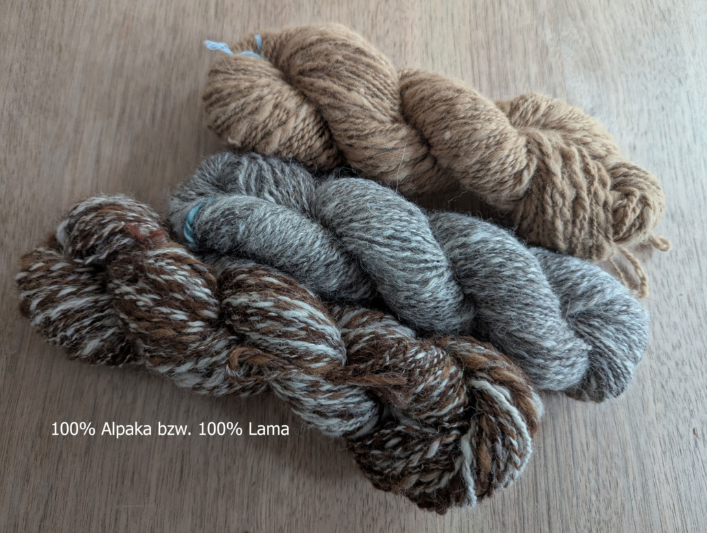 Zudem haben wir von unseren Alpakas Dis und Antje die Wolle per Hand von Heike Winkler verspinnen lassen. Erhältlich als Strang zu 100 g.