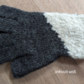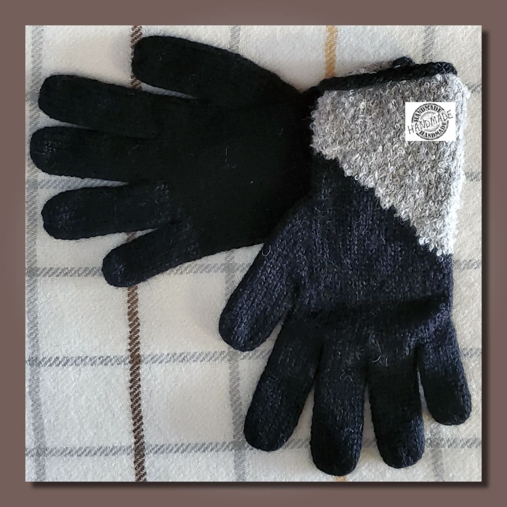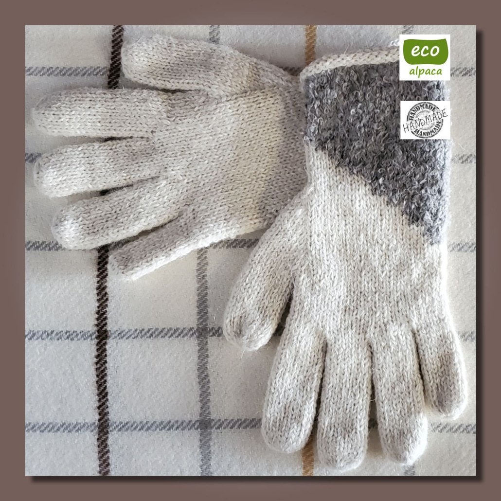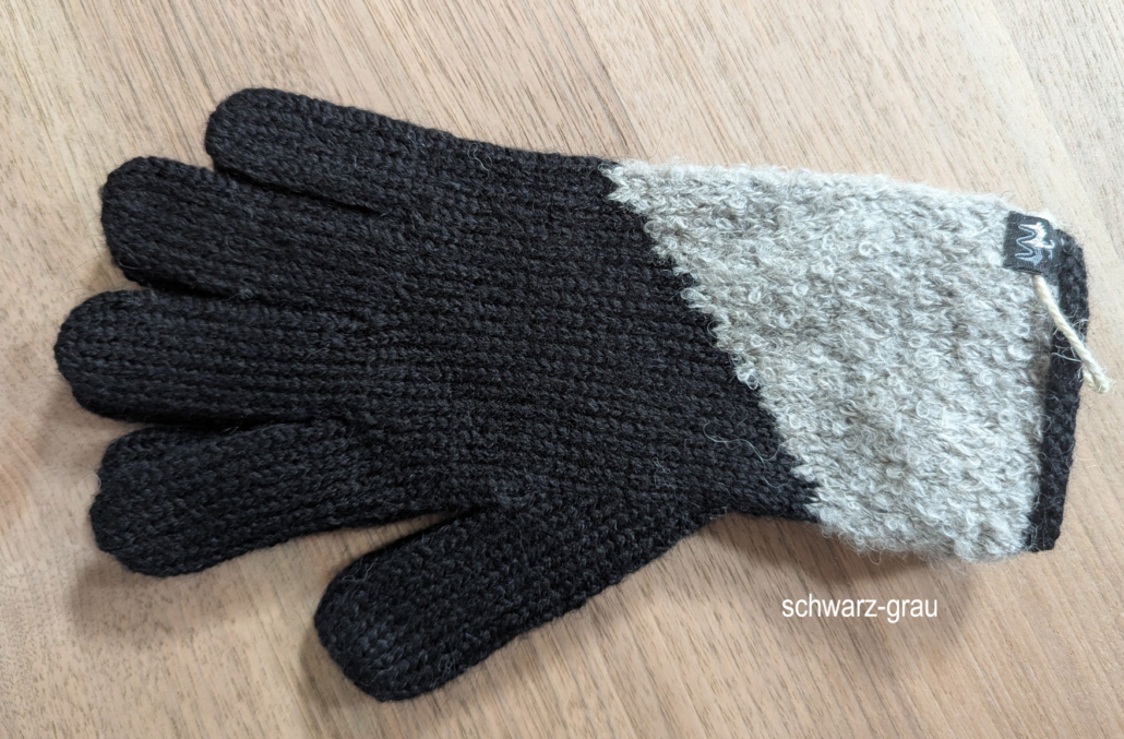 Schlichte klassische Handschuhe HUANCAYO aus Babyalpaka-Faser. Der Handbereich ist komplett glatt gestrickt aus reiner Babyalpakawolle, der dreieckige Strick-Einsatz ist Alpaka-Bouclé.