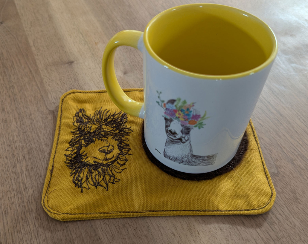 Diesen Tassenteppich muss man einfach haben. Nicht nur der edle Alpakafilz, sondern auch die aufwendige Lama-Stickerei machen dieses Dekoelement zu etwas ganz Besonderem. Ob auf dem Küchentisch, dem Schreibtisch oder in der warmen Jahreszeit auf dem Gartentisch, dieser MugRug sieht überall sehr hübsch aus. Genießt eure Tasse Kaffee oder euren Tee und erfreut euch gleichzeitig an dem freundlichen Lama.