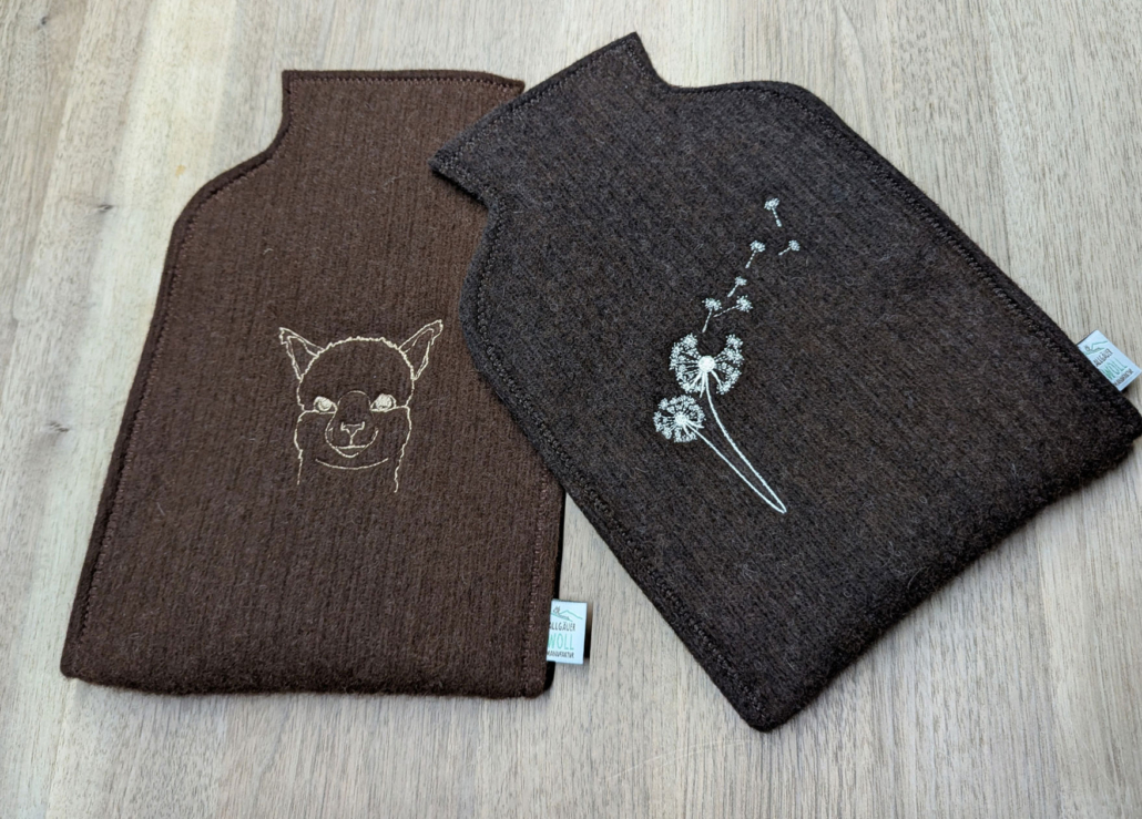 Wärmflasche klein 0,8 l – Stickmotive Alpakakopf und Pusteblume
